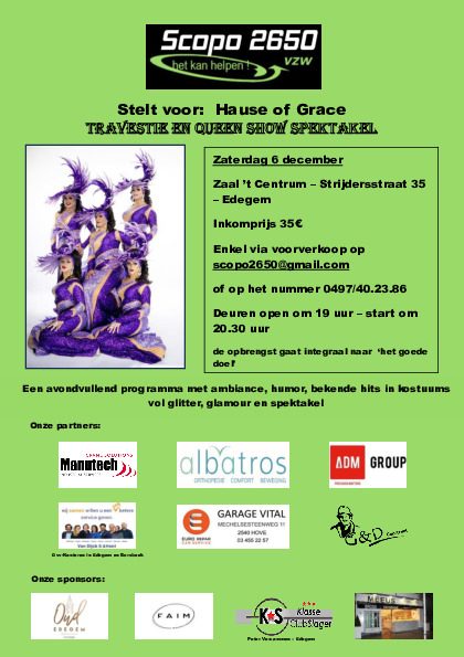 Scopo2650 is een erkende vereniging opgericht in Edegem op 20-02-2002 ” voor het goede doel “. SCOPO is italiaans voor “ doelgericht ” en 2650 is het postnummer van Edegem. Via sponsoring en ledenwerving kunnen wij elk jaar een behoorlijke som schenken aan de minderbedeelden onder ons. Dit onder de vorm van materiële of geldelijke steun. Jaarlijks organizeren we enkele activiteiten om geld in het laatje te krijgen zoals een “Breughelbuffet” en een “Kerstconcert” in de Lourdesbasiliek te Edegem.